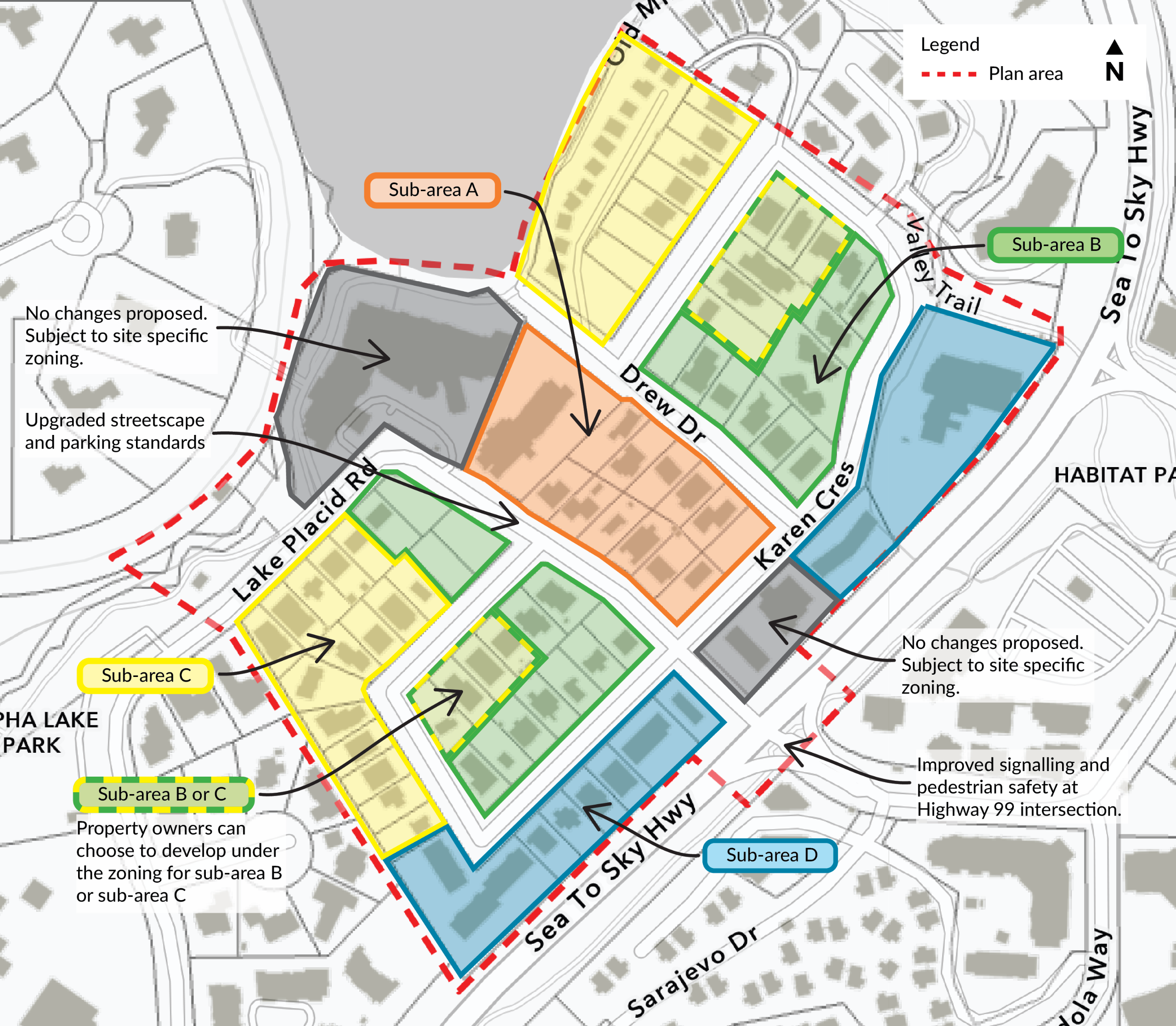 - Increasing density across the plan area, with the highest densities along Lake Placid Road and adjacent to Highway 99 in locations closest to nearby amenities and services.